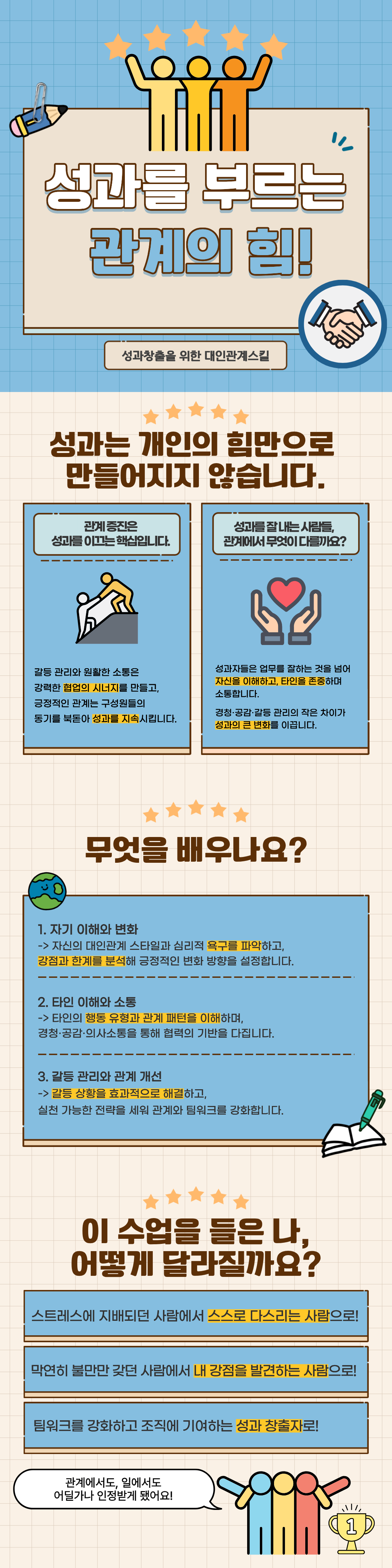 l 효율적인 스트레스 관리와 의사소통역량 강화로 대인관계능력과 팀워크를 향상시킬 수 있습니다.