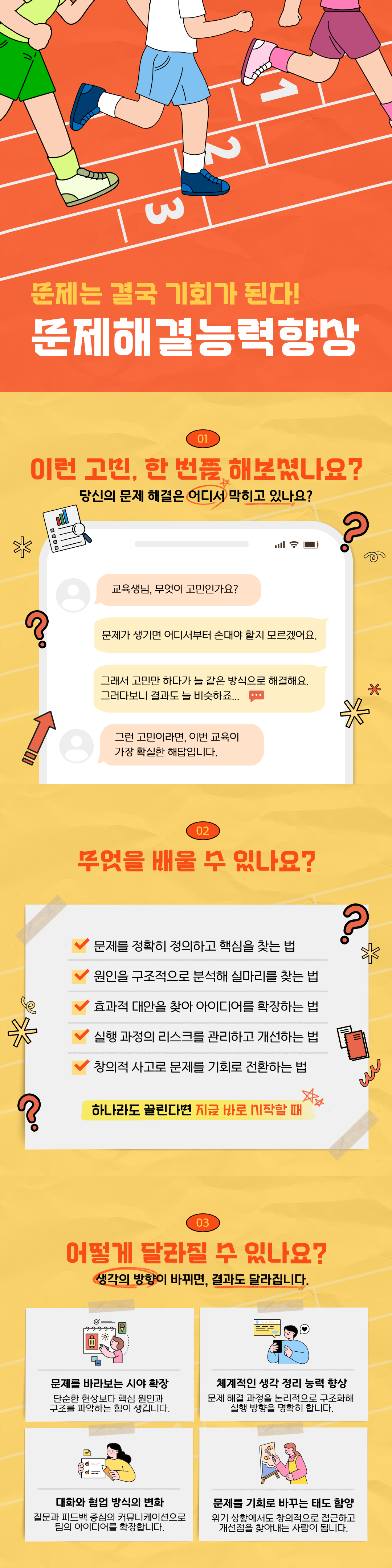 본 과정에서는 프로세스를 통해 문제를 도출하고, 다양한 아이디어를 이끌어내어 효과적이고 실행 가능한 해결책을 결정할 수 있는 방법을 안내 드립니다.