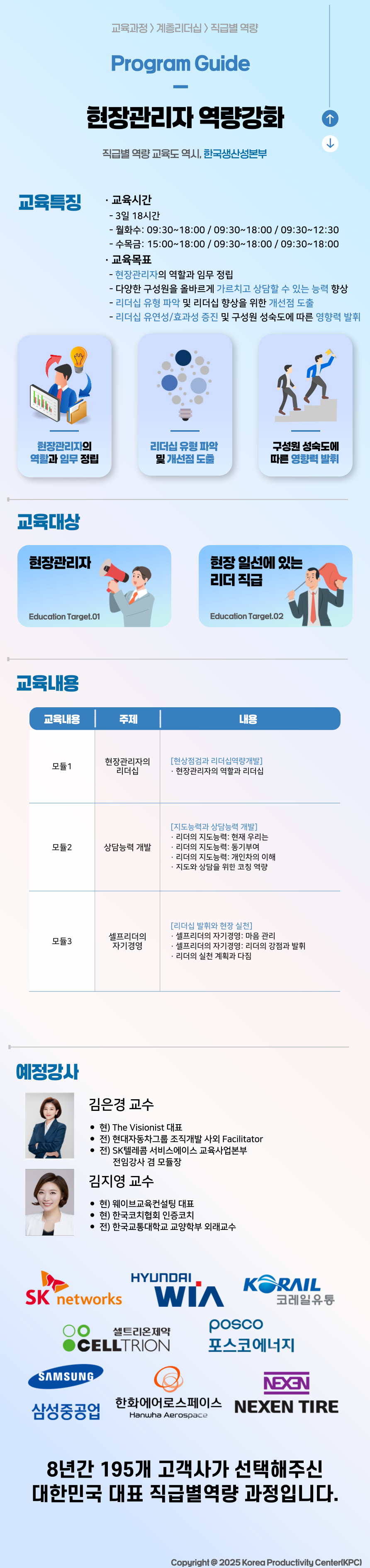 교육시간 | 3일, 18시간 / 1일차: 15:00~18:00 / 2일차: 9:30~18:00 / 3일차: 9:30~18:00 |