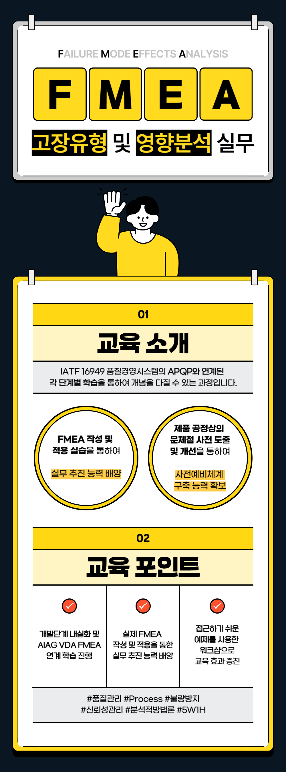 이해 - 설계/공정 FMEA 분석수준 상호관계 - 설계/공정 FMEA 추진개요 5. FMEA 7단계 적용 방법론 III. 설계 FMEA(D-FMEA) 추진 1. D-FMEA 필요성 및 개요 2. D-FMEA의 7STEP 추진 절차 및 사례 3. D-FMEA 실습 (FMEA 4판, AIAG VDA FMEA) |