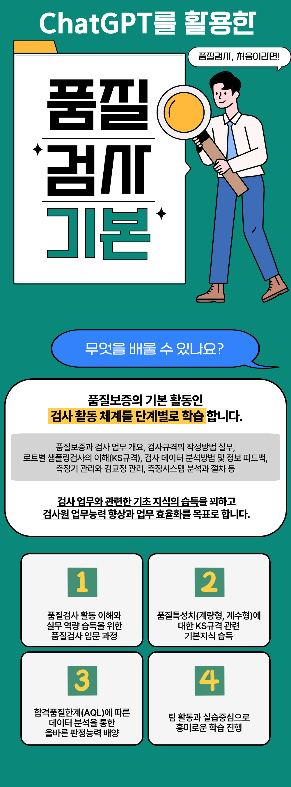 | o 검사규격의 작성과 준수 - 사내 표준의 분류 체계 속에 검사표준 이해 - 올바른 공정과 품질해석을 위한 QC공정도 작성 방법과 관리규격 - 검사 기준을 적용하기 위한 검사절차서의 구성내용 이해와 작성 방법 - 제품의 합/부 판정을 위한 검사규격 분류와 작성 방법 o 검사 데이터 분석과 정보 피드백 - 검사 데이터 분석 결과에 대한 검사성적서 작성 및 활용 방안 - 검사 데이터 분석을 위한 품질관리 7가지 도구 사용 방법 - 품질개선을 위한 품질정보 피드백과 개선조치 활용 방안 [실습] ChatGPT를 활용한 품질관리 7가지 도구 활용 히스토그램, 특성요인도, 파레토도, 산점도 등 |