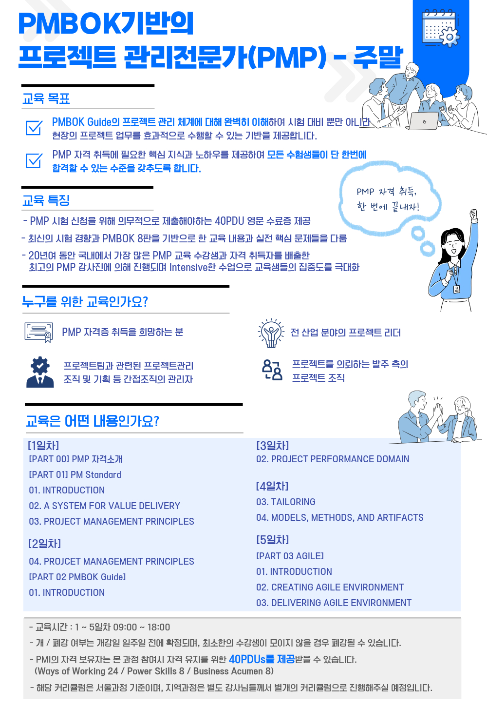 - PMI의 자격 보유자 (PMP등)는 본 과정 참여시 자격유지를 위한 40PDUs 를 제공받을 수 있습니다.